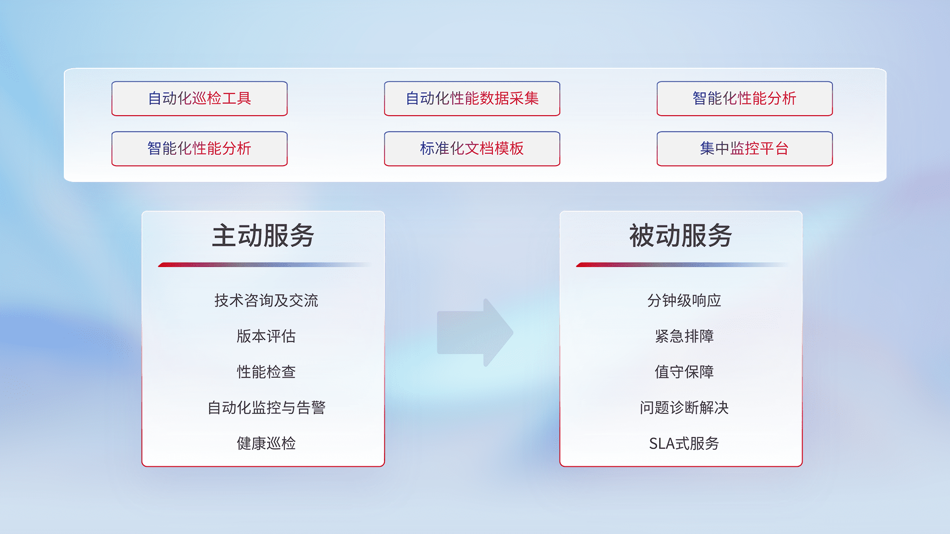 智能化工具和标准化文档,,,保障服务质量,,提供主动服务(包含技术咨询、、、版本评估、、、性能检查、、、自动化监控与告警、、健康巡检)和被动服务包含(分钟级响应、、、紧急排障、、值守保障、、、、问题诊断解决、、、、SLA服务)。。。